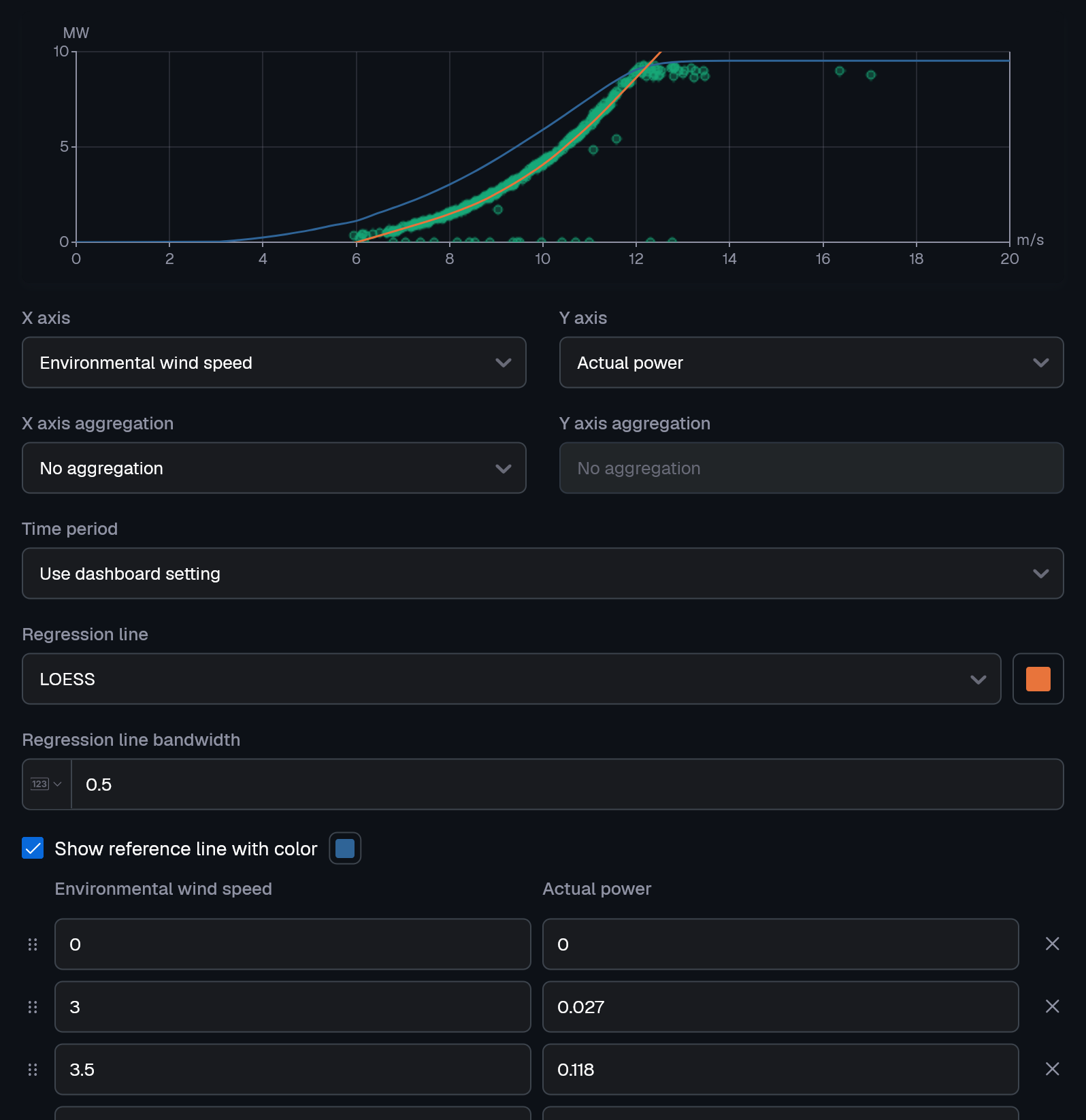 - Regression lines show the overall trend or relationship between two metrics. You can configure different algorithms in the widget settings, including linear, polynomial, exponential, logarithmic, power law, or smoothing.
