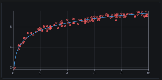 | Logarithmic | A curve that grows fast at the start, then slowly grows with infinitely smaller numbers. The logarithmical base defaults to the Euler constant (e in the formula) and can be overwritten with a static number or property value. | y = a·logₑ(x) + b | |