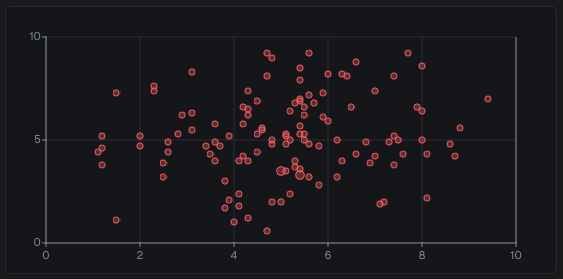 A scatter plot can be used to visualize two different series against each other by selecting metrics for the x-axis and y-axis. Combinations of x and y values that occur more often are grouped together and will result in bigger dots.