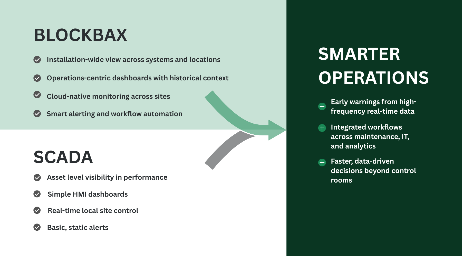While SCADA systems remain essential for real-time asset control and monitoring, the value significantly amplified when paired with a platform like Blockbax.